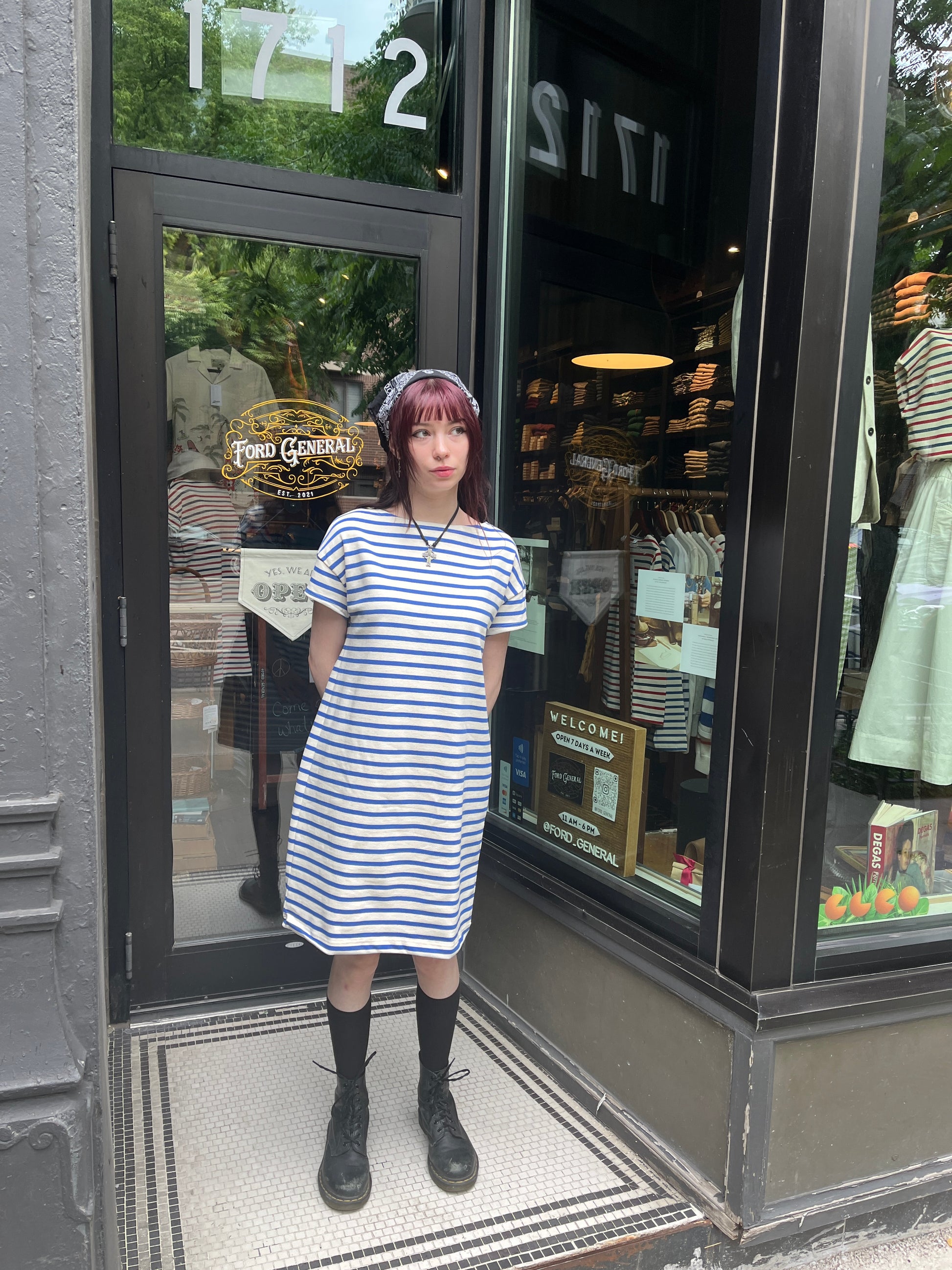 Made of 100$ mid-weight cotton, this striped dress is perfect for the summertime. With a boat neckline and short sleeves this original French mariner dress is sure to turn heads.