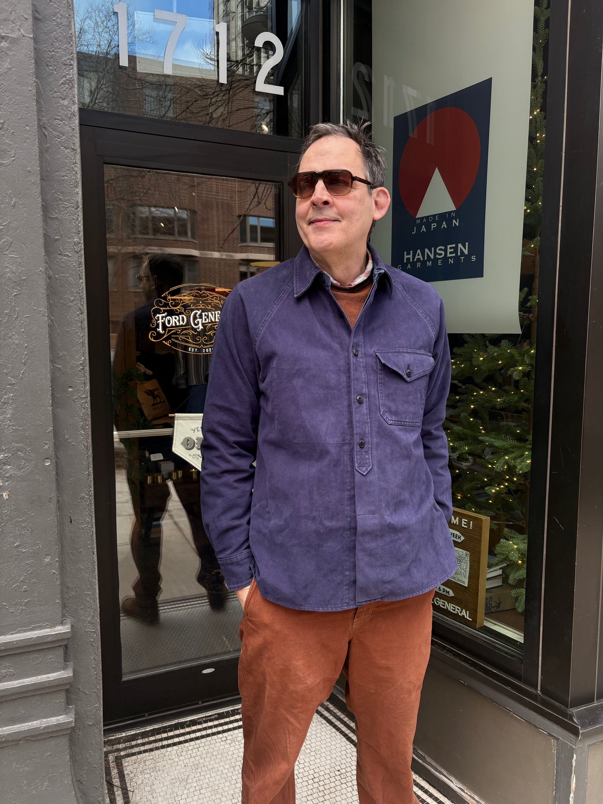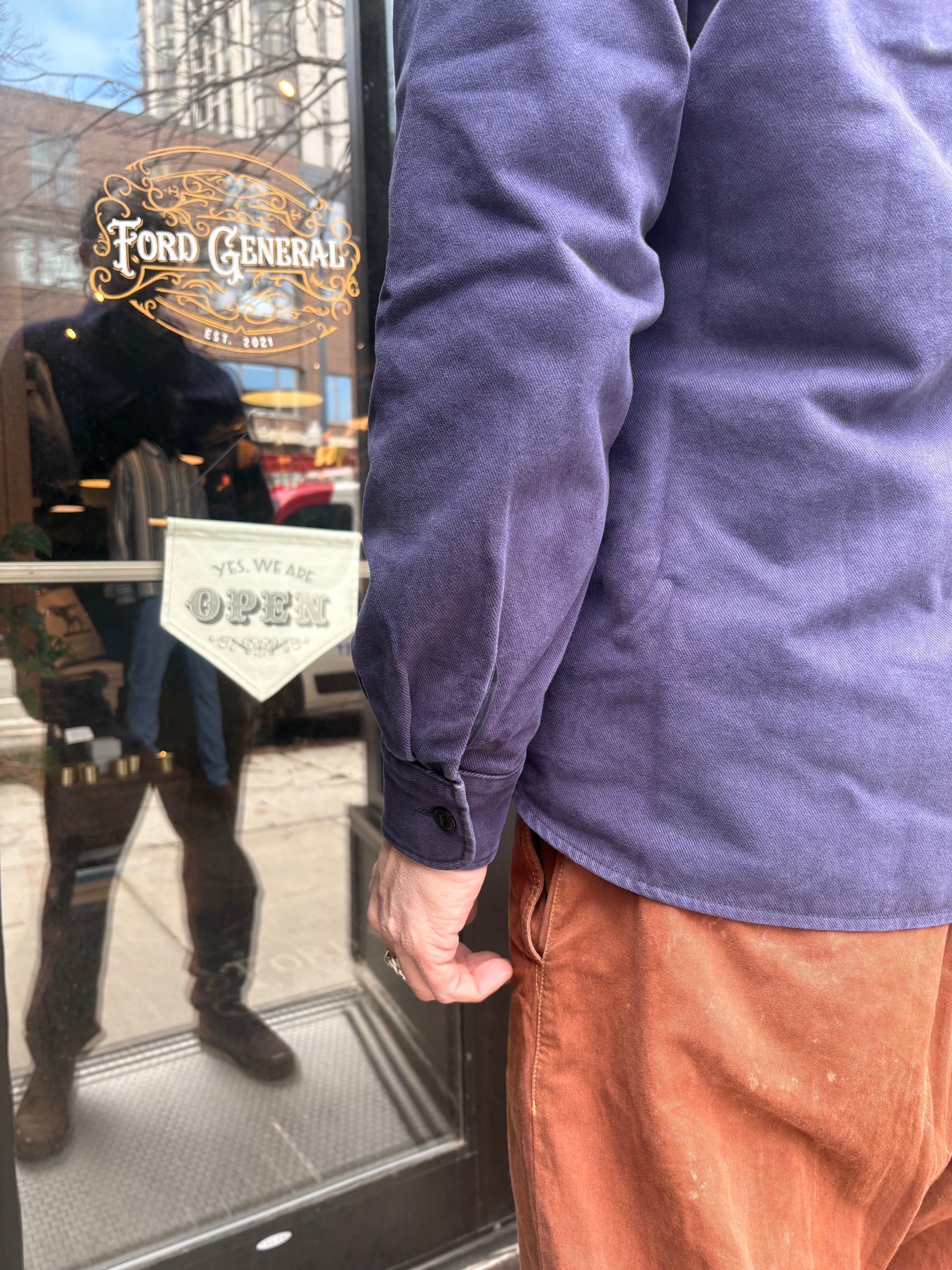 This handsome overshirt offers a stylish and sturdy addition to any wardrobe. 100% Cotton Twill manufactured in the UK by revered Brisbane Moss mills. Raglan sleeves allow for easy movement and a natural fit. One no nonsense chest flap pocket has a nifty button closure, and those same buttons (black corozo) adorn the jaunty half mast exterior placket. Inside there's a hidden pocket for the things you hold dear. The blue is at once bracing and mellow--the perfect fade of a sun and salt cured ocean.