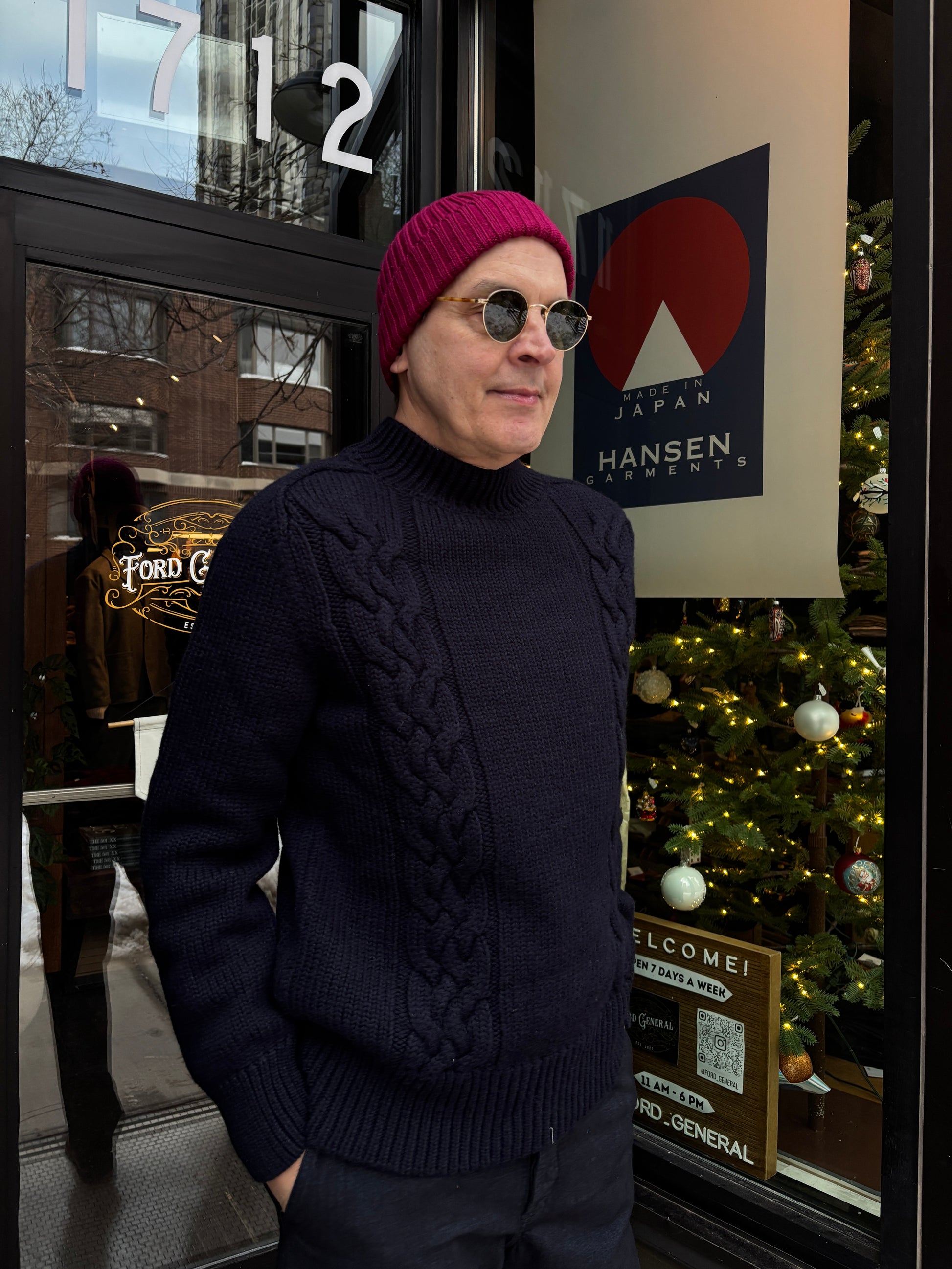 This traditional cable knit is well executed. 100% wool, and made in Portugal.