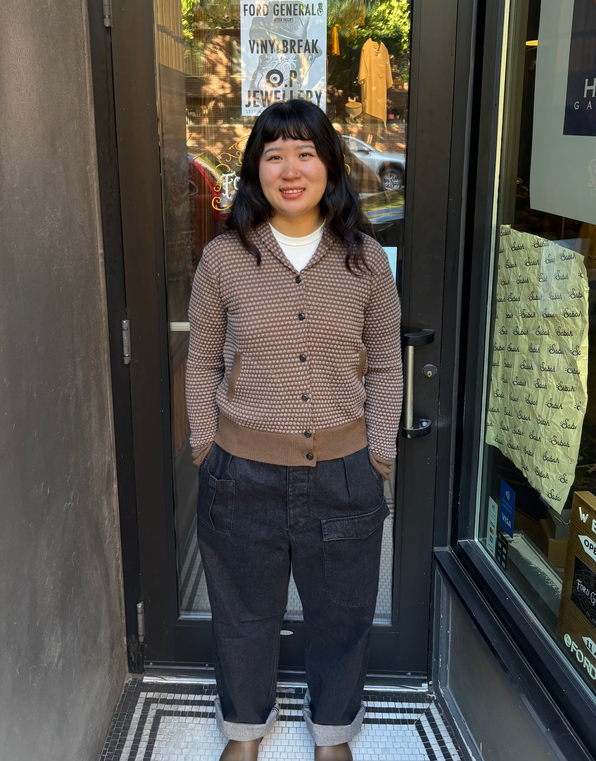 100 % merino wool. Super warm and yet fitted to the body. Shawl collar cardigan made by the renowned knit makers GRP in Tuscany. This heritage piece has their spot knit technology the makers developed in the 1970’s. Two tone color pattern. Limited stock. Great gift for the winter season.