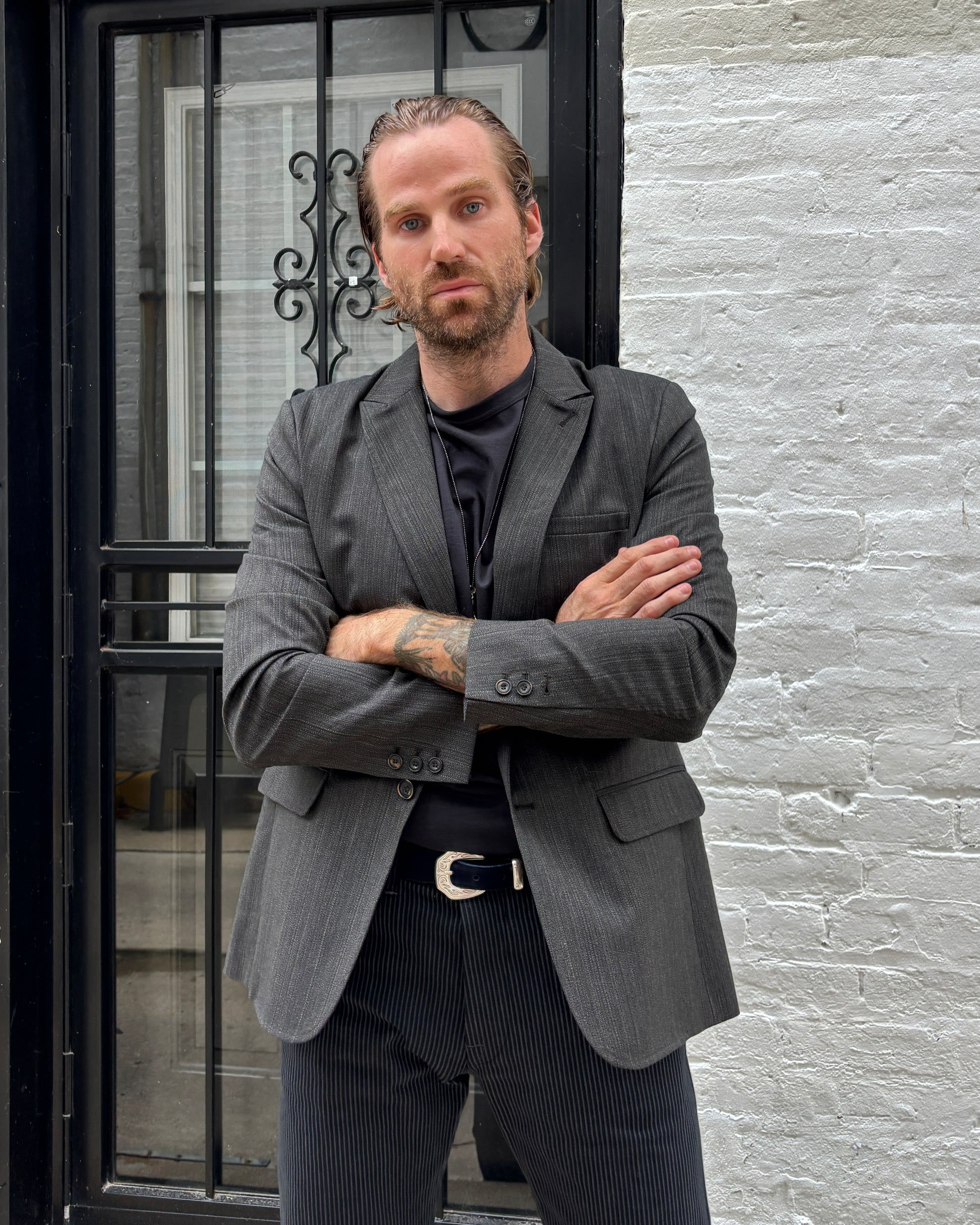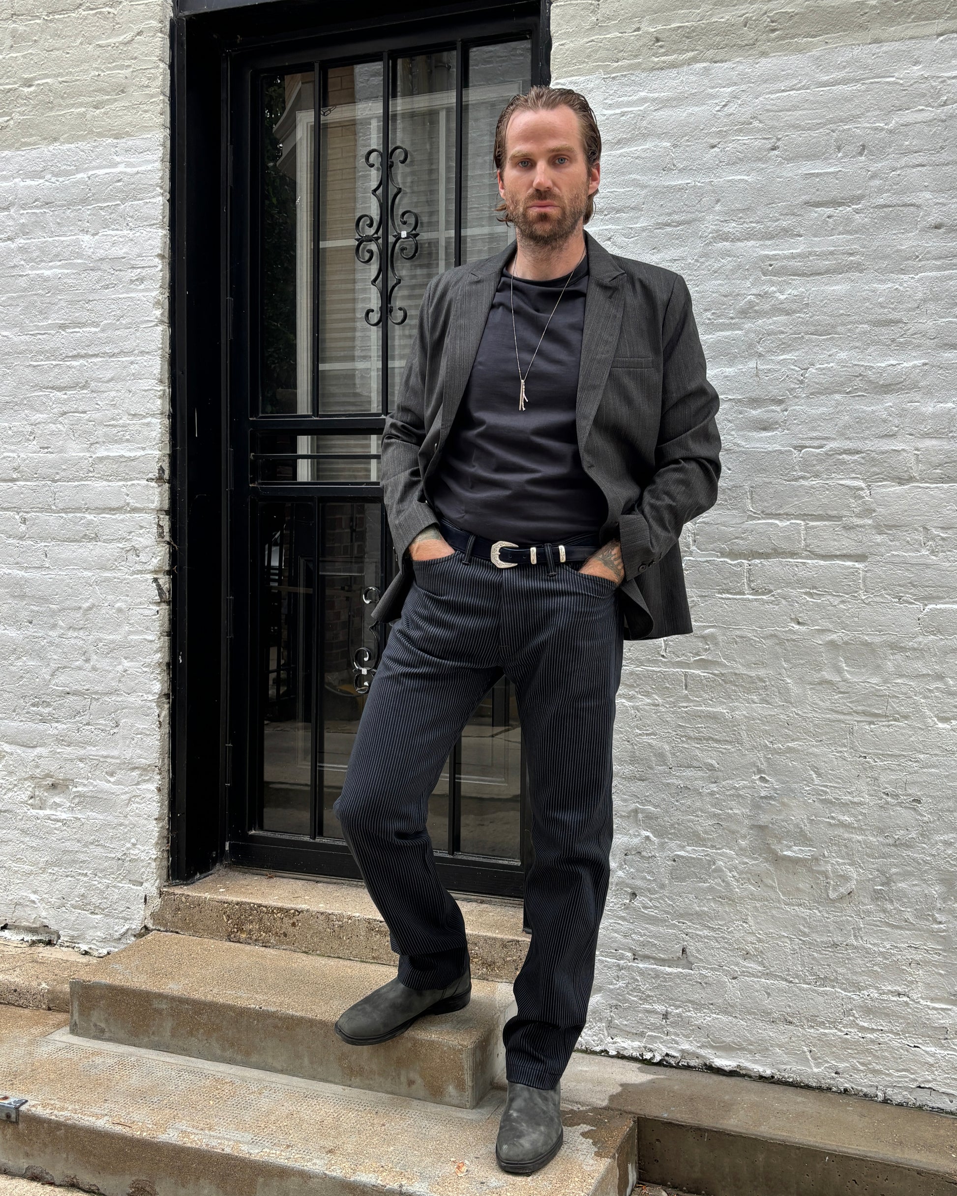 The Italian fabric is a blend of cotton and wool with a complex broken stripe design that has the look of a vintage find.