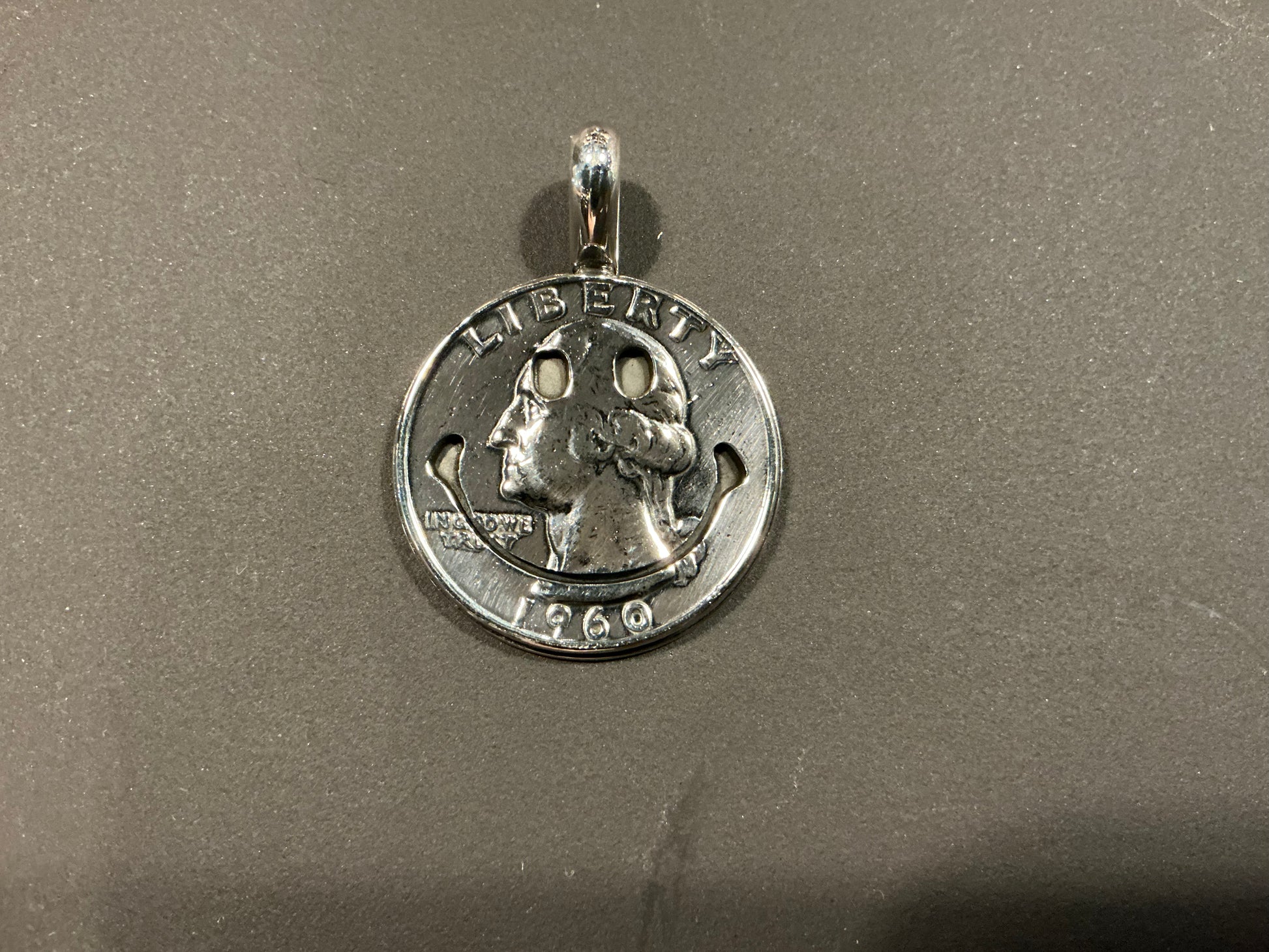 Crafted by North Works in partnership with the Harvey Ball World Smile Foundation, this 1960 quarter coin pendant features a distinctive stamped-through smiley face. The design merges numismatic artistry with a symbol of positivity, making it a meaningful accessory that reflects both craftsmanship and a commitment to spreading smiles. Ideal for those who appreciate unique jewelry with a story.