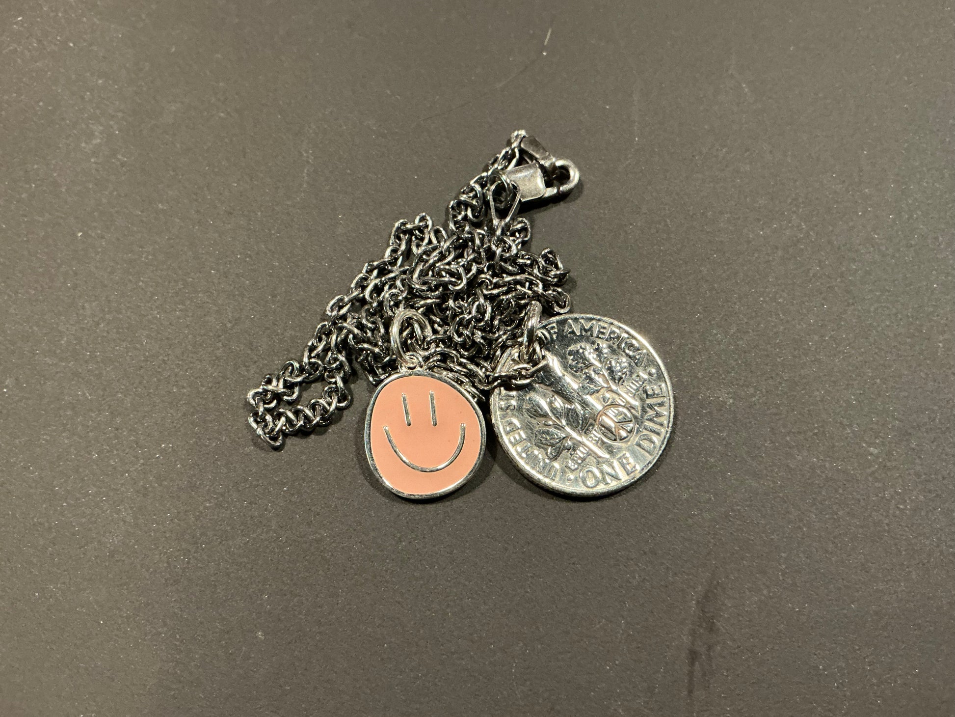 The North Works Dime Necklace is crafted from authentic mid-20th century dimes. Three of the necklaces include enamel smiley face tags featuring peace symbols and one enamel flower tag stamped with LOVE. This expert design artfully combines vintage currency with symbolic accents, creating a refined and meaningful accessory.