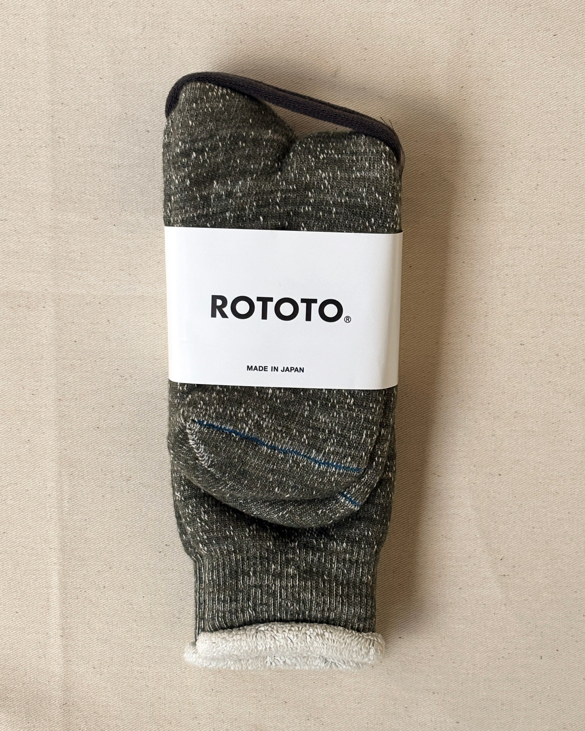 Inspired by mountaineering socks, these are one of the first products made and sold by Rototo. Colored Merino wool forms the outside with undyed cotton loops on the inside, creating a plush, sweatshirt like feel.