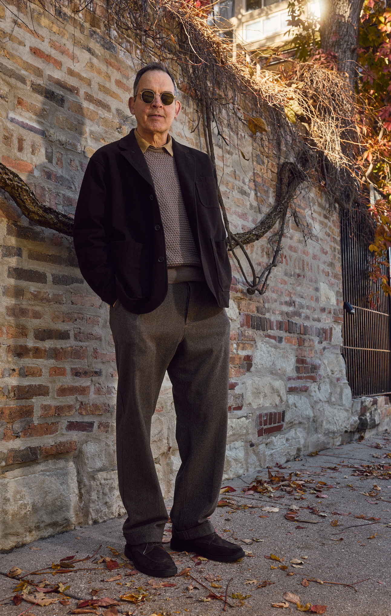 This very elegant fabric is woven in a heritage mill in Tuscany, famous for its craftsmanship and quality. The ecru base has a fine black pinstripe and the metal content gives it an intentionally creased and rustic surface." -Hansen Garments