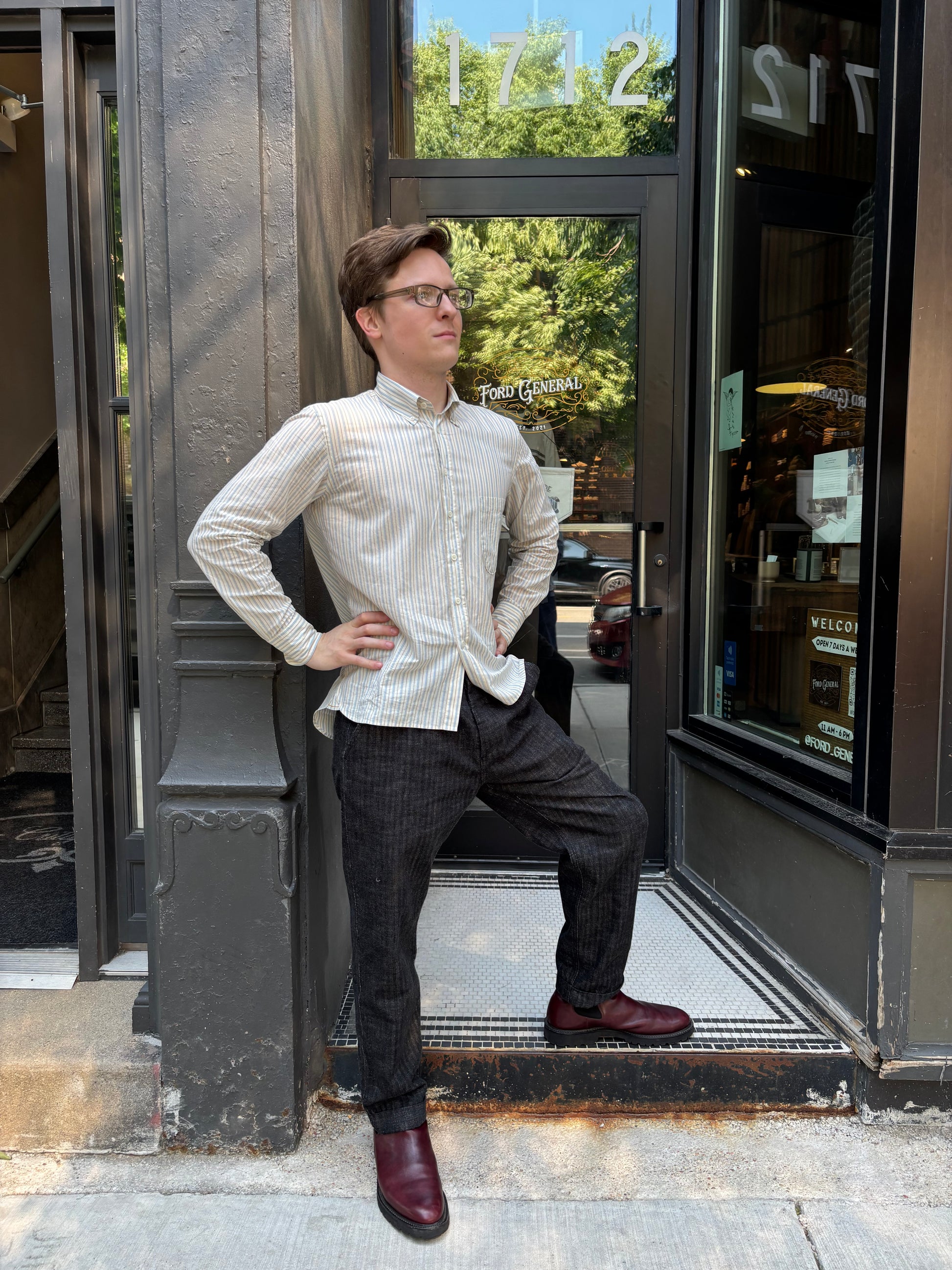 The Universal Works Super Chino offers a comfortable, loose fit through the hips and thighs, tapering neatly to the hem for a modern silhouette. Featuring a mid-rise waist and a classic button fly, these chinos combine style with practicality. Two front pockets and two rear jetted buttoned pockets provide convenient storage, while the turn-up cuffed hem adds a refined finishing touch. Ideal for those seeking both comfort and tailored design in their everyday wear.